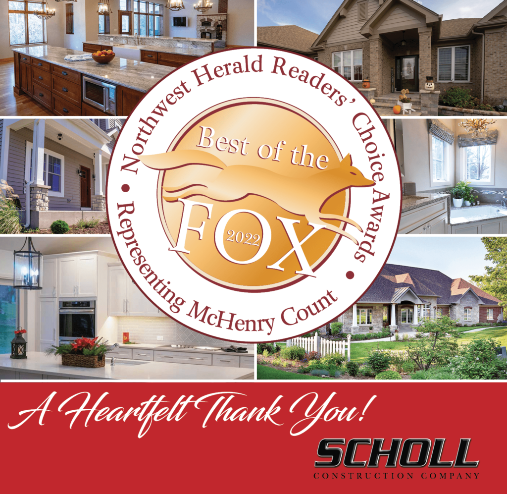 We are excited, humbled and honored to announce Scholl Construction has been named Best Home Builder and One of the Best Remodelers in the Best of the Fox for 2022. Thank you to all of you that took the time to vote for us and other favorite businesses throughout McHenry County. It is a distinction that we don’t take lightly and we look forward to another year of contributing to the growth of McHenry County and surrounding areas.
